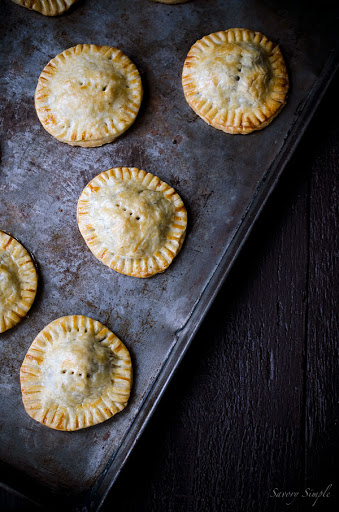 Preheat the oven to 425 degrees F. Line two baking sheets with parchment paper. Roll out the pie dough so that it’s very thin. Use a 3 1/2 inch cookie cutter to create rounds (a different size may be used but filling quantities will need to be adjusted accordingly). Place half of the rounds on the prepared baking sheets.