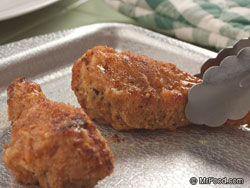 Dredge chicken in flour, one or two pieces at a time, coating both sides evenly. Dip floured chicken pieces into egg mixture, then place in bread crumb mixture; close bag and shake to coat well.