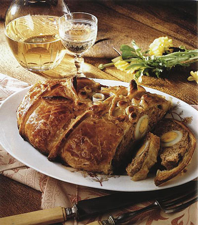 3. On a floured work surface, unfold cold puff pastry and cut into two rectangles. Roll both sheets of pastry into 8" × 11" shapes. Place one pastry rectangle on a nonstick baking sheet. Divide meat mixture in half and spread half on pastry. Put hard-cooked eggs in a line down middle of meat. Pat remaining meat over eggs. Pull up pastry on the sides, then completely cover with a second rectangle of pastry. Cut off excess pastry, wet edges with water, and press together. Cut a small hole in center of pâté and place a small piece of rolled parchment in it to allow steam to escape during baking. Beat remaining egg with a little water and brush wash over pâté. Cut decorative shapes out of excess pastry and press onto pâté.