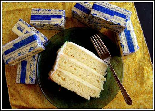 To assemble the cake, place one cake layer on a serving plate, with the flat bottom side facing down. Spread half of the Butter Filling over the surface of the cake. Top with another cake layer, inverted, so the bottom of the cake is facing up. Spread with the remaining butter filling. (USE WOODEN SKEWERS TO HOLD CAKE LAYERS IN PLACE)Place the remaining cake layer, also inverted, on top. Cover and freeze for at least 1 hour. While the cake is in the freezer, prepare the frosting.