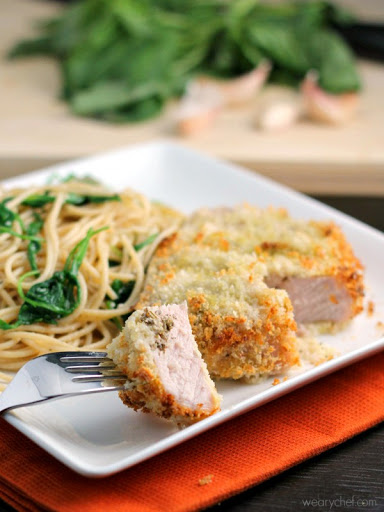 Slice slits in pork chops almost all the way through but leaving the bottom of the meat intact. The slits should be about ¾" apart and not extend all the way to the edges of the meat. Also cut a couple shallow slits in the fat on the outer edge of the meat to keep the pork chops from curling during baking.