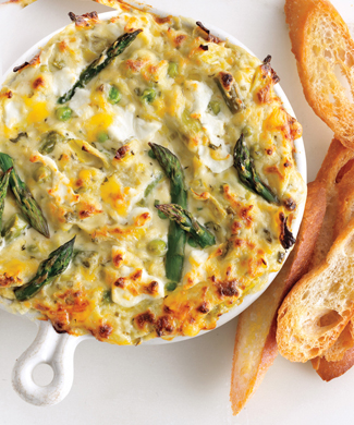 Transfer mixture to a 4-5-cup baking dish; arrange asparagus tips on top and dot with another 2 ounces goat cheese. Bake until golden brown and bubbling, 15-20 minutes. Let rest for 5 minutes before serving.