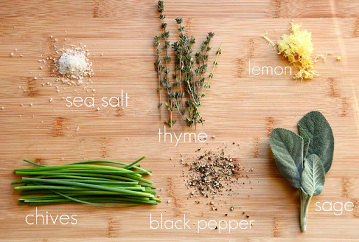 Place butter in a small bowl. Using a fork, mash until softened. Add salt and pepper and mash to incorporate. Add thyme, sage, and lemon zest. Mash to incorporate. Lastly, add the chives and stir to combine. Place butter on a piece of plastic wrap and tighten into a small dish. Chill until ready to use.