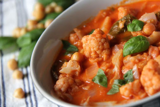 Chop cauliflower and any tender cauliflower leaves and toss into the pan, adding all other remaining ingredients.