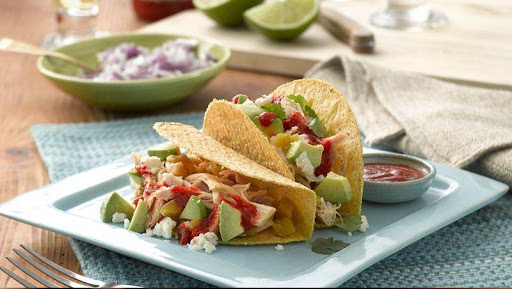2 Spoon filling into warm taco shells. Top with avocado and crumbled queso fresco and drizzle with sriracha sauce.