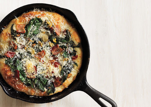 Spread chard mixture over dough. Bake until crust is golden and cooked through, 6–8 minutes. Scatter bacon and cheese over; cook just until cheese is melted, 2–3 minutes longer.