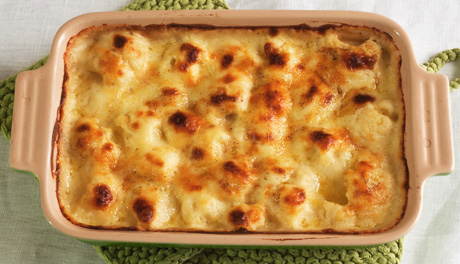 Remove the green outer leaves from the cauliflower, place it on the steamer rack, and steam until tender, about 10 minutes. Transfer to a large bowl to cool. Once the cauliflower is cool enough to handle, use your hands to gently break the florets from the thick central stalktry to break the cauliflower into large florets rather than small pieces. Arrange the florets, in one layer, in a 12- by 8-inch baking dish and set aside.