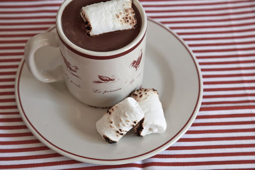 Add the melted chocolate to the hot milk. Whisk together until completely blended and super delicious looking. Pour into mugs and top with marshmallows or slightly sweetened whipped cream.