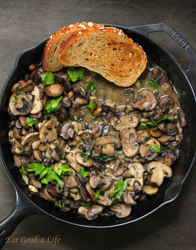 Add the wine and let it reduced by half. Add the vegetable stock, salt and parsley and let it simmer for about 4 more minutes, or until the sauce reduces slightly. Turn the heat off. Add the butter and more chopped parsley if desired and serve while still warm with toasted whole grain or any other whole grain of your choice such as quinoa, brown rice, pasta etc.