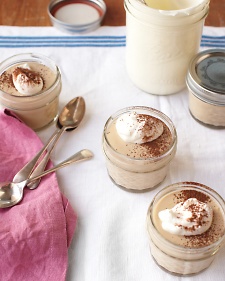 In a small saucepan, heat 1 cup cream and espresso powder over medium until warm, stirring occasionally with a silicone spatula. Gradually whisk warm cream mixture into egg mixture until combined, then return to saucepan. Stirring constantly, cook over medium until mixture thickens, about 8 minutes. Transfer to a bowl and whisk in gelatin mixture. Press plastic wrap onto surface of espresso mixture and let cool completely (do not refrigerate), about 45 minutes.