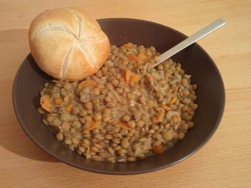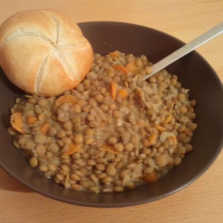 Erst nachdem die Linsen durch sind den Suppenwürfel und die Gewürze dazu, nochmals kurz aufkochen und anschließend 5 bis 10 Minuten ziehen lassen. Zum Ende dieser Zeit mit Essig, Salz und Pfeffer anbschmecken.