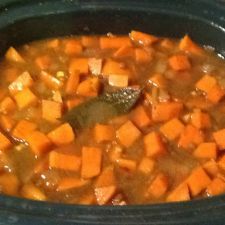 Abgeseihte Linsen und darauf und mit reichlich Wasser auffüllen (mehr als bedeckt). 15 bis 25 Minuten mit den Loorbeerblättern leicht köcheln lassen, während dieser Zeit die Karotten dazuschneiden (in Scheiben).