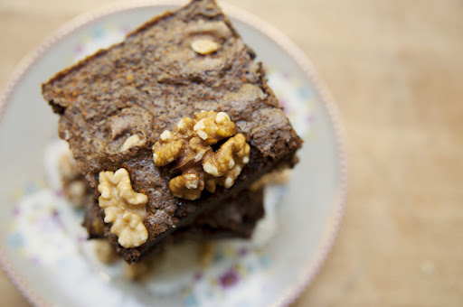Preheat oven to 350 and pop in the walnuts until just toasted, about 5 minutes. Sift together the flour, spices, and cocoa powder. Meanwhile, melt the chocolate in a bowl over boiling water, add the coffee and stir to combine, then let cool. In a small saucepan, melt the unsalted butter until browned, and add to the melted chocolate. Beat together the eggs and sugar until thick and shiny. Continue beating on low while adding flour mixture and wet ingredients alternatively. Finish with the vanilla. Do not over mix. Fold in the chips. Pour into a buttered and floured 9 x 13 pan and sprinkle the walnuts on top. Bake for 25-30 minutes.