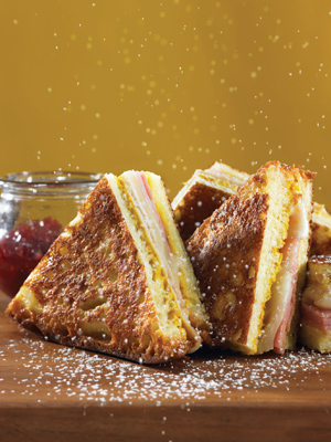 For stovetop method: Heat the butter in a large nonstick skillet over medium heat. Dip each sandwich into the egg mixture, turning to coat both sides. Transfer the sandwiches to the pan. Cover and cook for 3 to 4 minutes, until the undersides begin to brown. Turn the sandwiches and press lightly with a spatula to compress the filling slightly. Cover and cook for about 3 minutes, or until the bread is golden brown. (Watch carefully, because the delicate bread can burn easily.) Turn once more and cook for 1 to 2 minutes, until the cheese has melted completely. Let stand for 5 minutes. Sprinkle with confectioners’ sugar. Cut diagonally in half and serve with a dollop of jam alongside.