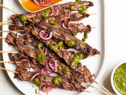 Heat a grill or grill pan to medium high. Season the steak with salt and pepper. Brush the grill with olive oil, then grill the skewers until marked, about 1 minute per side. Serve with the chimichurri and pickled onion.