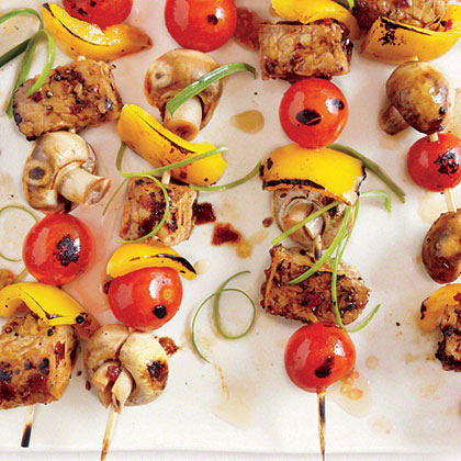 4. Thread tempeh, tomatoes, mushrooms, and bell pepper alternately onto each of 8 (6-inch) skewers. Place skewers on grill; grill 10 minutes or until browned, turning after 5 minutes and basting occasionally with half of honey mixture. Drizzle with remaining honey mixture; sprinkle with onions.