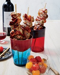 Light a grill or preheat a grill pan. Alternately thread the pork and bacon-wrapped turkey onto wooden skewers. Oil the grill grates. Season the skewers with salt and grill over moderately high heat, turning, until lightly charred, about 5 minutes. Transfer the skewers to the baking sheet and roast for 7 to 10 minutes, until the meats are just cooked through. Transfer the skewers to the platter and serve with the tomatoes.