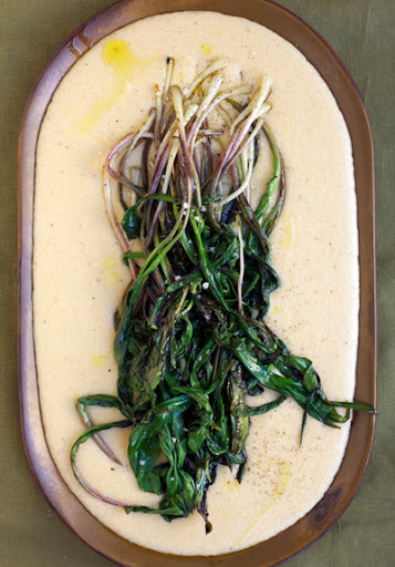 2. Heat a cast iron grill pan over medium-high heat. Grill ramps in 2 batches until leaves are wilted and ramps are tender and slightly charred, about 5 minutes. Place over grits, drizzle with oil and season with salt and pepper.