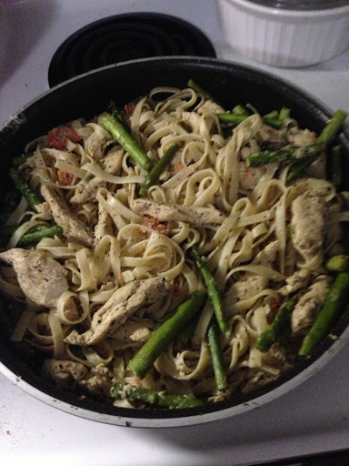 2.Meanwhile, heat the olive oil in a large skillet over medium. Add chicken and cook until lightly browned, 5 to 7 minutes, stirring. Add asparagus and basil and cook until softened, 3 minutes.