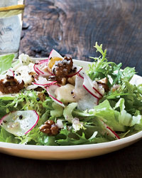 Add the shredded romaine lettuce to the bowl along with the toasted walnuts, radishes, sliced celery hearts, celery leaves, chopped frisée, raisins and apple. Toss well and serve right away.