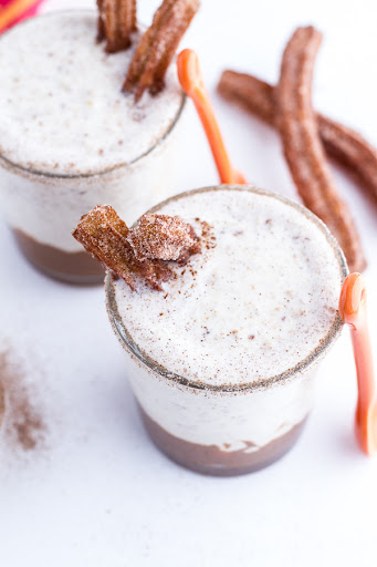 To a blender add 2 churros (adding more if you want an extra cinnamony flavor. I used 4 churros, but it was a little intense. So good, but a little intense), ice cream, milk, vanilla extract, coconut rum or tequila if using and 2 tablespoons warm dulce de leche. Blend until your desired consistency is reached. If you do not want chunks of churros blend until completely smooth.