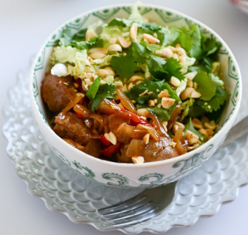 Serve immediately over brown jasmine rice. Top with the cabbage, peanuts, cilantro and a spritz of lime.