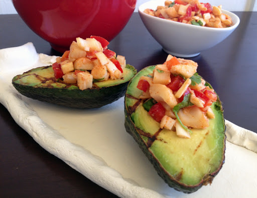 CADRY'S GRILLED AVOCADOS STUFFED WITH SMOKY HEARTS OF PALM SALSA. VEGAN GLUTENFREE