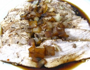 Makes 5 servings, Each serving about 5 ounces sliced pork plus sauce (the pork does shrink a bit when cooked)
