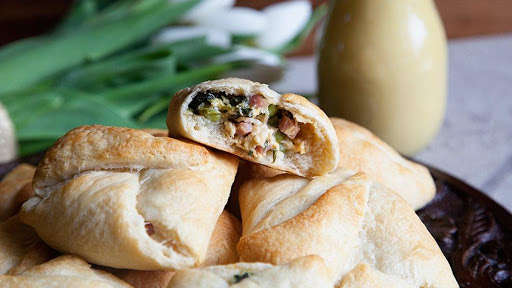 4 For each bundle, fold 1 short corner up over filling to center. Bring long point up over filling; you will have a little tail. Pinch top to seal. Fold remaining short corner of dough up over filling to center; pinch dough to completely seal filling inside dough to form of bundle. Fold tail over to top of bundle. Place on cookie sheet.