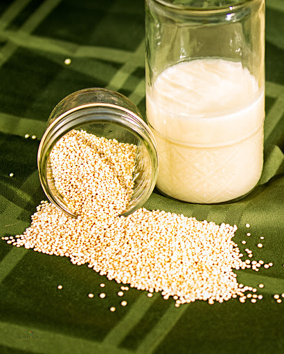 In batches, put cooked quinoa in blender with up to 6 cups of water and remaining ingredients.