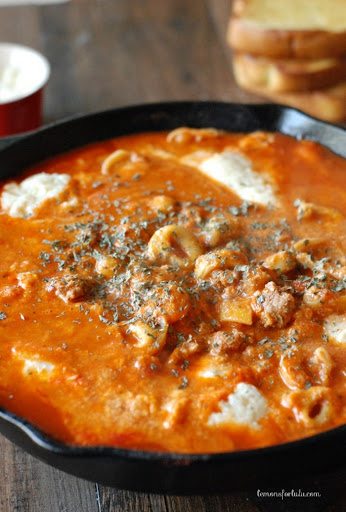 In a small bowl, combine egg, ricotta cheese, mozzarella, Parmesan, basil, oregano, salt and pepper. Drop cheese mixture into sauce, cover and cook an additional 3-5 minutes or until slightly melted. Serve.