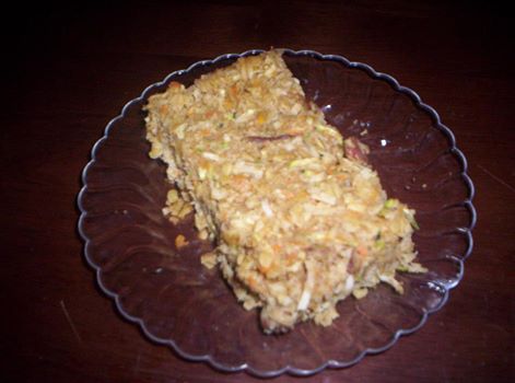 Mix all dry ingredients and then all wet. Add together. Put into a 9x9 baking dish with parchment paper on the bottom of pan. Bake a 350 for 40 minutes. Makes 6 servings