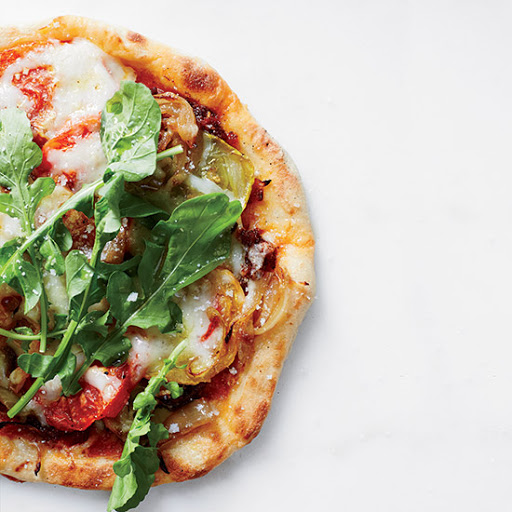 Spread the flatbreads with the nduja. Top with the tomatoes, onions and cheese. Bake for 7 minutes, until the cheese is melted. Top with the arugula and a sprinkling of olive oil, vinegar and fleur de sel.