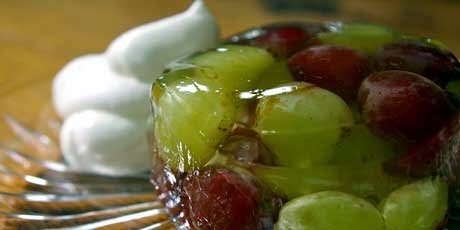 Arrange the grapes in 6 ramekins or tea cups. Pour over the wine mixture. Cover, and chill several hours to set. To serve, run a knife around the edge of the moulds and dip the bottoms into hot water for a few seconds, then invert onto serving plates. Whip the cream with the sugar and flavouring to serve alongside.