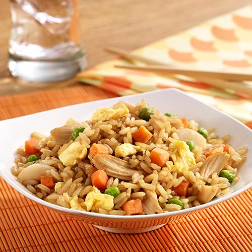 Stir in water chestnuts, chicken, peas and carrots, soy sauce and garlic powder. Cook 3 to 4 minutes more or until hot, stirring occasionally.