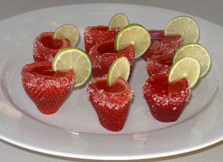 Place the strawberries on a plate and fill them with the strawberry margarita gelatin. Put the plate in the refrigerator. Refrigerate for at least four hours or until firm.