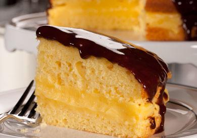 In a medium bowl, whisk together pudding mix and milk until thick and smooth; spread over bottom cake layer. Place remaining half cake layer cut-side down over pudding. Chill while preparing Chocolate Glaze.