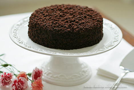 Meanwhile, crumble the remaining cake layer. Apply the remaining frosting to the cake. Sprinkle it liberally with the cake crumbs. Refrigerate for at least one hour before serving.