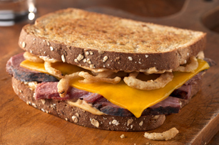 SPREAD bread slices with mayonnaise; fill with all remaining ingredients except butter.