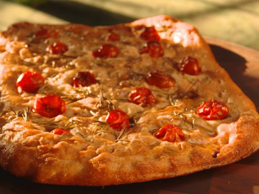 Spread a half sheet tray with the remaining olive oil. Lay the dough on top and stretch and pat out until it reaches 10-by-16-inches, an oval rough shape is ideal. Use your fingertips to press in small indentations. Sprinkle evenly with the cherry tomatoes, sea salt and rosemary leaves. Let rise again for 20 minutes.