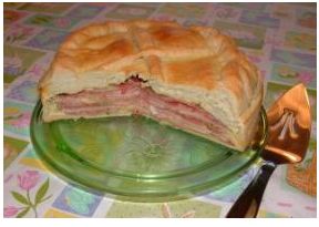 Pizza Chena is a southern Italian savory "full pie" with a variety of cheese, cold cuts, and eggs encased in a bread crust.