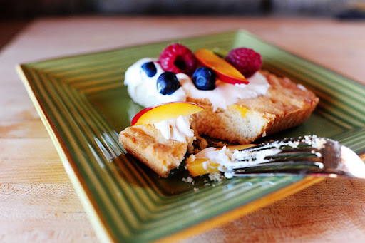 Using a mixer with a whisk attachment, whip together marshmallow creme and cream cheese until light. Spread onto cooled “pizza” crust, then decorate the top generously with sliced fruit. Slice into squares or wedges and serve.