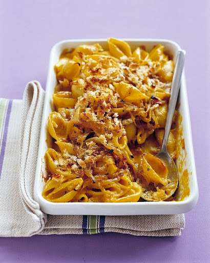Stir squash and reserved pasta water into onions; simmer 2 minutes. Toss squash mixture and 1/2 cup Parmesan with pasta. Transfer to prepared dish.