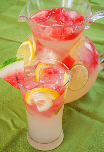 To make the lemonade: Mix 2 cups of sugar syrup, watermelon, lemon juice, and lime juice in a big bowl or pitcher. Add the ice cubes, diced watermelon and other fruit. Add the orange, lemon, and lime rounds. Stir well and chill until icy cold.