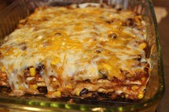 2. Spread 1/2 cup of the beef mixture on bottom of 9X13 pan (sprayed with pam). Top with 3 of the tortillas, overlapping as needed. Layer with 1/2 of the remaining beef mixture and 1/2 of the cheese. Repeat with remaining tortillas, beef and cheese.