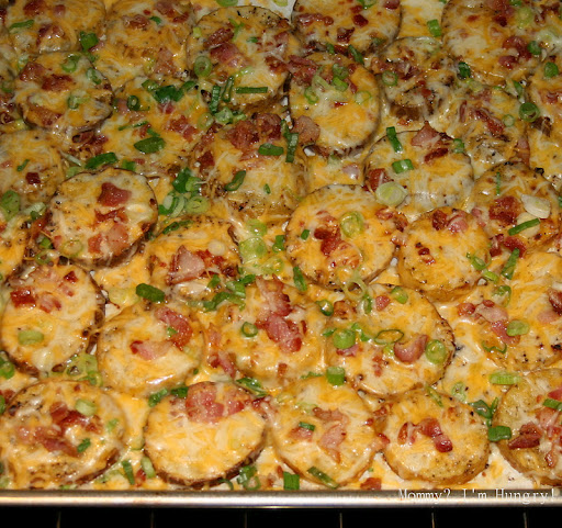 When potatoes are ready, top with bacon, cheese, and green onion; continue baking until the cheese has melted (I just turned the oven off and let the heat melt it all). Serve with sour cream if desired.