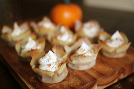 4. Bake in pre-heated oven 12-15 minutes, or until pumpkin filling is set, and wonton wrappers become slightly golden brown. When completely cooled, place whipped topping in a large ziplock bag, and snip off one of the corners. Pipe whipped topping onto each pumpkin pie just before serving.
