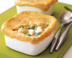 Place in a 6-cup (1.5-L) baking dish or individual baking dishes. Roll out pastry 1/4-inch (5-mm) thick to cover top of dish. Cut a 1-inch (2.5-cm) strip from edges of pastry. Brush edges of dish with water and lay strip around edges. Brush with egg. Lay remaining pastry on top, sealing edges. Cut a steam hole, decorate with any extra pastry cut in shapes, if desired. Brush with egg.