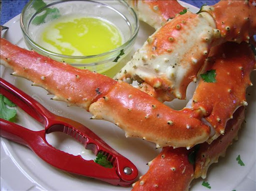 Serve crab legs with melted butter for dipping and wedge of lemon.