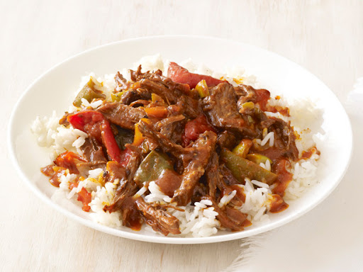 Combine the tomatoes, ketchup, vinegar, garlic, cumin, jalapeno and 3/4 teaspoon salt in a 5-to-6-quart slow cooker. Add the steak, bell peppers and onion and toss to coat. Cover and cook on low, undisturbed, 8 hours.